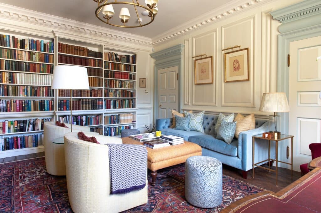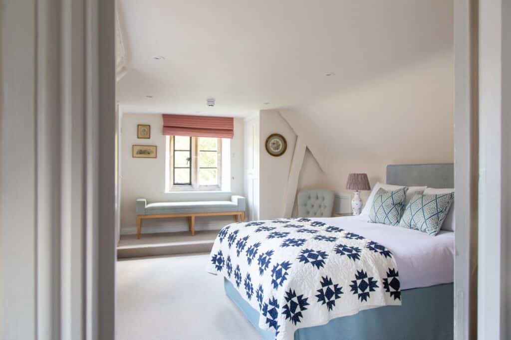 The house boasts a stunning dining hall which can seat between 8-22 guests, complete with huge stone fireplace and recently discovered original stone archway. There is also space to add round tables to accommodate up to 36 for dinner. Off the dining hall is the peaceful, light-filled library, which has a gorgeous marble open fireplace, a hidden TV, and a drinks cupboard. The owners’ love of art deco and the infamous Annabel’s interiors served as inspiration for the drawing room, which opens onto the front lawn and is ideal for evening cocktails. The drawing room, dining hall, and library all flow together to provide a seamless entertainment space. There is a lovely, panelled study with a sofa and an open fire, ideal for working, or use it as a treatment room and indulge in a spa treatment from a local therapist.