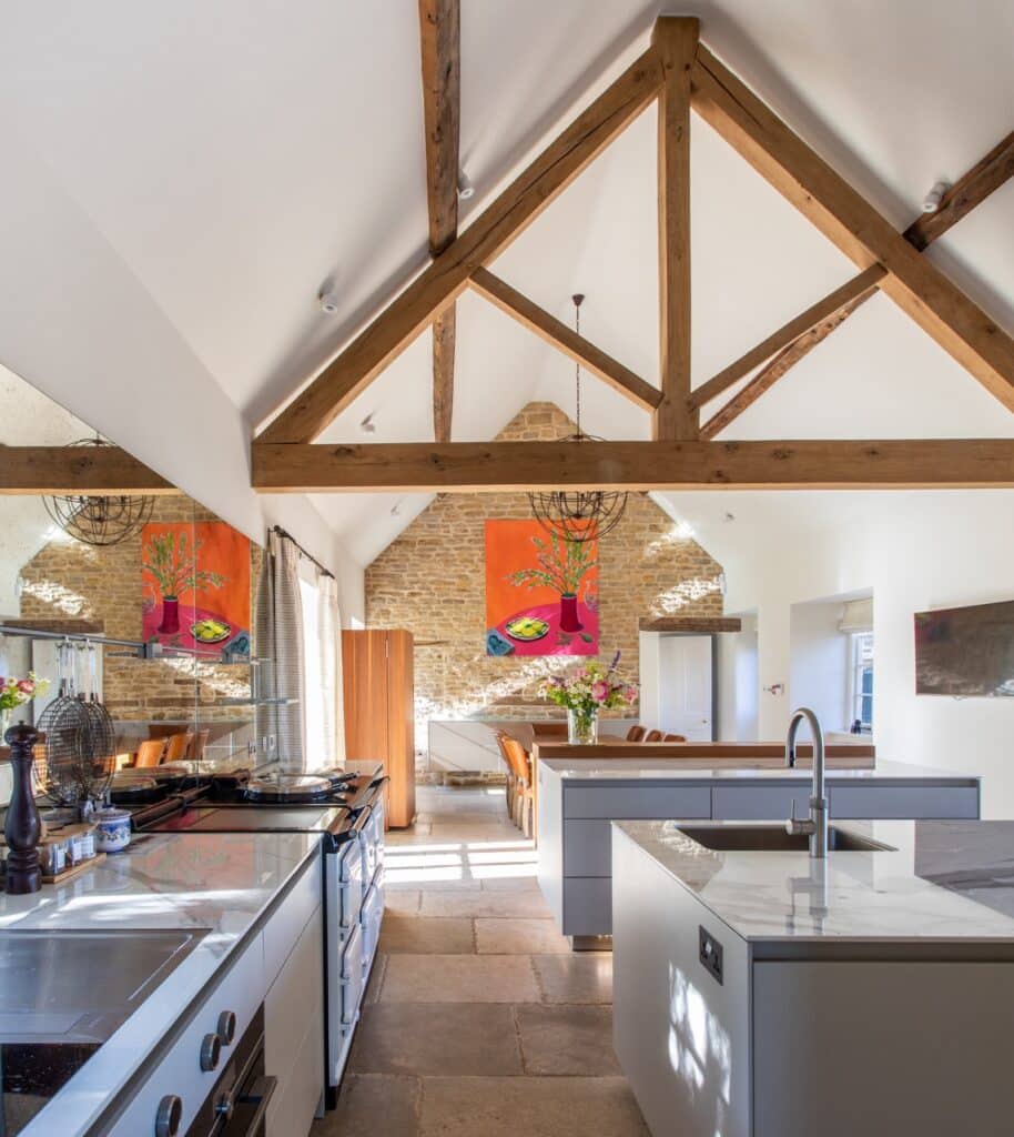 The kitchen is well equipped for both families and professional chefs, with a 5-door electric AGA, two steam combination ovens, two induction hobs, a Teppanyaki pan, drinks fridge, two dishwashers, an ice maker, a glass washer, and a quooker cube tap that provides boiling, filtered, and sparkling water! A spacious table seats up to ten people, and French windows open onto the back lawn terrace and courtyard. The scullery leads into the Victorian walled kitchen gardens.